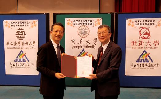 為有效推動「十二年國民基本教育課程綱要總綱」(又稱108課綱),臺北市立復興高中於109年5月19日,邀請本校及淡江、文化、中原、銘傳、實踐、世新、大同、亞洲、真理、中信、台藝大、元培、政大哲學系等14所大學校(系),於該校進行「築夢夥伴學校(策略聯盟)簽約」合作儀式,本校由趙維良副校長偕同招生組陳雅蓉組長、黃昭明編審前往與會。
