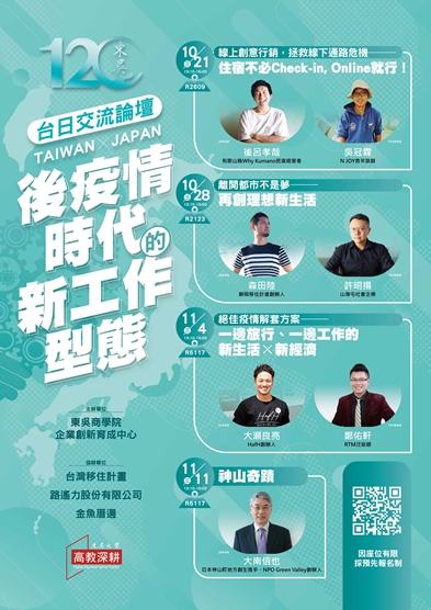 東吳商學院企業創新育成中心舉辦一系列「後疫情時代的新工作型態」的台日交流論壇。其中第二場次於109年10月28日在城中校區2123會議室舉辦,主題為「離開都市不是夢—再創理想新生活」,由金魚厝邊彭仁鴻老師擔任主持人,特別邀請靜岡移住計畫創辦人森田陸先生、山海屯社會企業創辦人許明揚先生,以遠距視訊方式擔任與談人,一同探討多據點工作與移住生活的未來趨勢。
