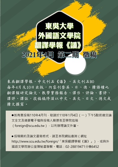 《譒》第二期即日起開始徵稿,截稿期限為110年1月4日,歡迎各位老師及同學踴躍投稿,投稿規定與論文體例請至外國語文學院官網查詢。