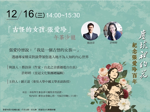 談起張愛玲,我們會想起她顛簸跌宕的際遇,豐沛的文采,以及愛恨交織的戀情,她曾說自己是一個古怪的女孩。12月16日星期三下午2點到3點半,本館將於外雙溪校區普仁堂推出「古怪的女孩-張愛玲」午茶沙龍,由本校中文系鍾正道老師主持、知名作家蔡詩萍及皇冠文化集團總編輯許婷婷對談,聯手打造一場充滿文學氣息的知性饗宴,精彩可期,不可錯過。他們將從不同世代與不同角度解讀張愛玲作品的獨特性與內涵,帶領讀者進入她不為人知的內心世界,勾勒出屬於她的故事。本校教職員生可至電子化校園系統報名,學生參加者可獲得美育認證。校內同仁參加並登錄心得,可採計時數1.5小時。