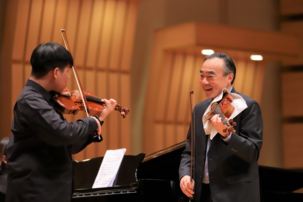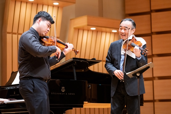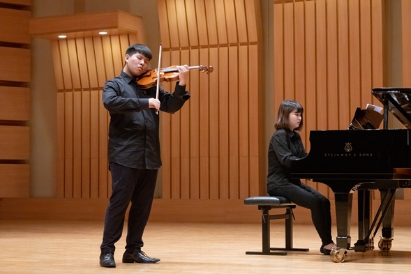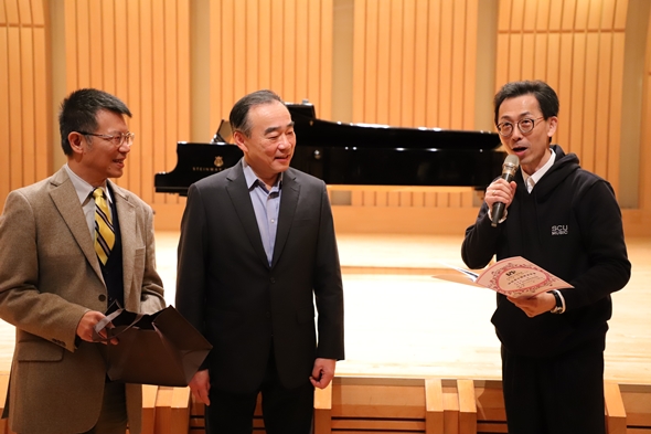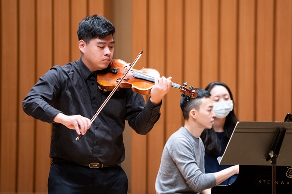 學生在台上全神貫注的演奏音樂,音樂家在台下全心全意的側耳傾聽,這並不是平時的音樂系演奏會,而是經過學系甄選,才能夠上台接受國際知名音樂家指導的「大師班」課程。本校音樂系主辦的「2020國際大師班在東吳」系列活動,於109年10月至12月期間展開。12月16日邀請到曾獲《音樂美國》選為年度器樂演奏家,同時也曾與各國著名交響樂團合作演出、名聞國際的台裔美籍小提琴家林昭亮老師,至外雙溪校區松怡廳進行大師班授課。