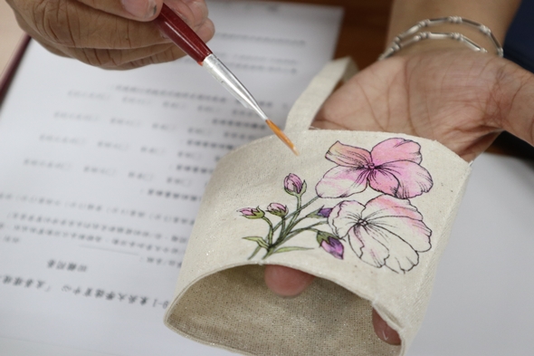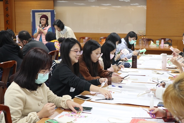 什麼是「蝶古巴特」?它是法語Decoupage的音譯,代表的是將美麗的東西貼到物體上面。此次工作坊,材料有杯套、水彩畫筆、白膠以及各式圖案的餐巾紙。首先,老師請大家挑選桌上印滿圖案豐富的餐巾紙,接著剪裁成自己喜歡的樣式,作為之後貼在杯套上的圖案。在一剪一貼的過程中,需要非常地細心與專注,以免弄破餐巾紙。雖然有同學說著自己快要失去耐心,但仍開心地將圖案黏貼在杯套上,最後設計屬於自己的提袋樣式。