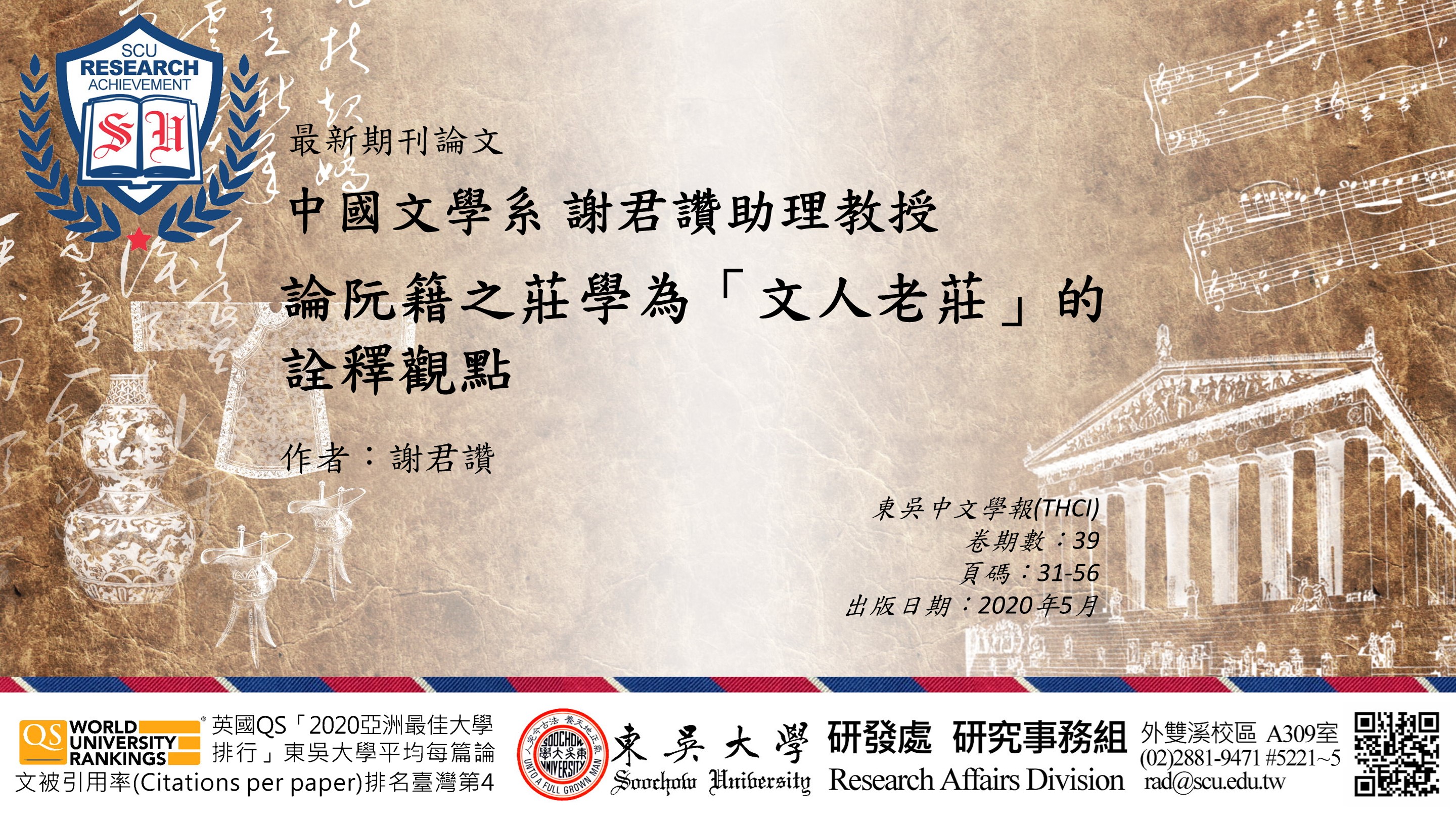 研究事務組小提醒:教師如有最新發表於AHCI、SSCI、SCI、EI、TSSCI、THCI、「東吳大學外語學門獎勵名單」之期刊論文,歡迎將相關資訊e-mail至rad@scu.edu.tw,研究發展處將會公告於校園頭條,以廣交流。