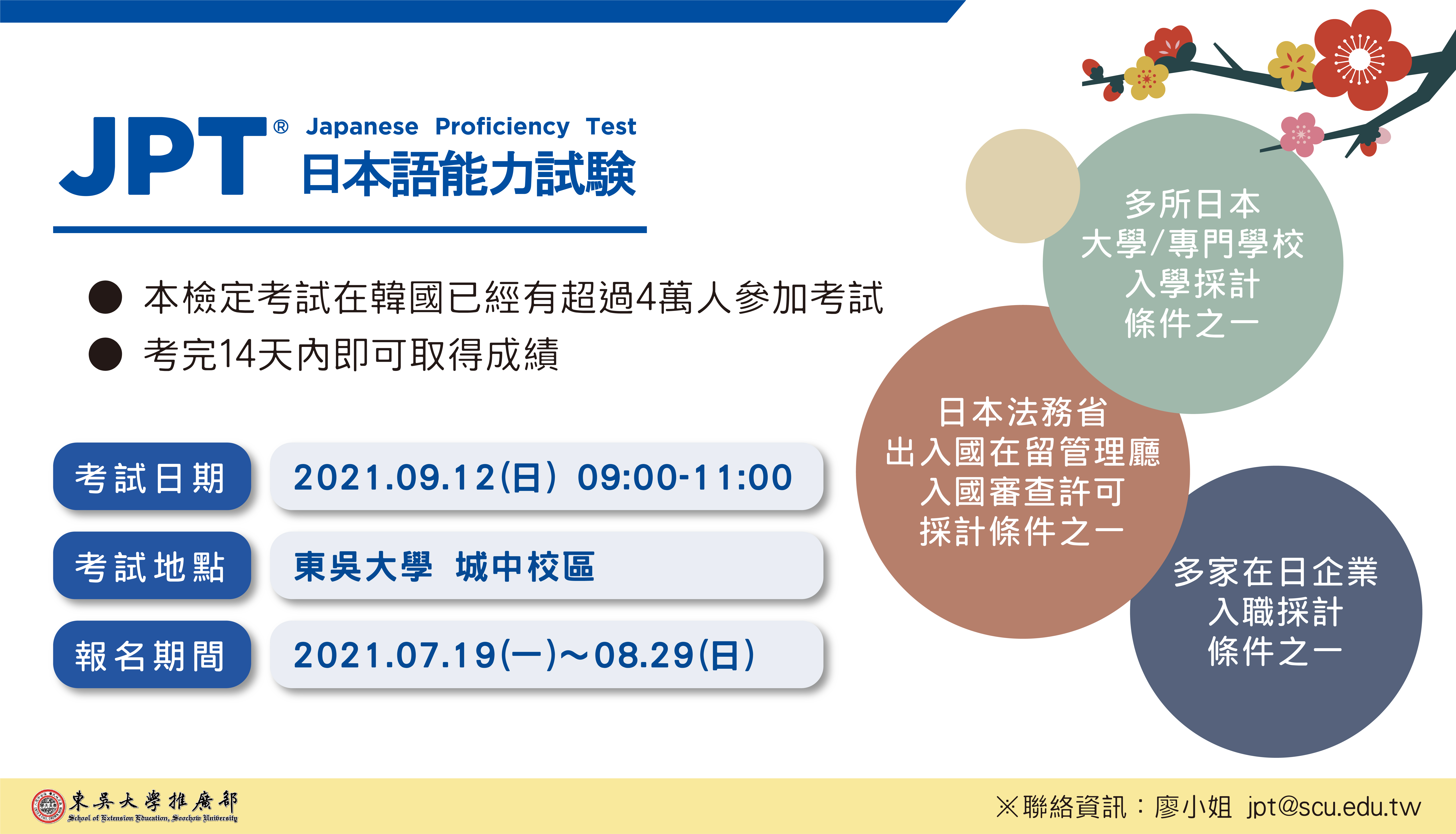 近期JPT日本語能力試驗訂於9月12日(日),詳情請上東吳大學推廣部官方網站/ 委訓合作/ 語言證照/ JPT日本語能力試驗—第354梯次(https://www.ext.scu.edu.tw/courses3.php?gid=5d74e0a2-e6db-11eb-b223-000c29ad6982),報名期間為7月19日(一)至8月29日(日)。