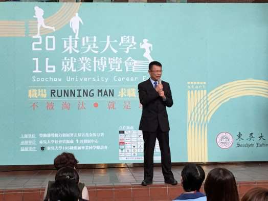 由勞動部勞動力發展署北基宜花金馬分署與本校社會資源處生涯發展中心於3月17日在雙溪校區聯合舉辦「東吳就業博覽會」,邀請了近60間企業單位進駐,中午在望星廣場舉行了開幕式,除了熱舞社熱力四射的表演,以及主持人中文系鄭訓典、謝翰哲同學的精采開場,還請到潘維大校長和社會資源處顧名儀處長蒞臨致詞,勉勵同學提早與企業接觸,如果不想被未來淘汰,就趕緊趁現在努力去爭取機會。