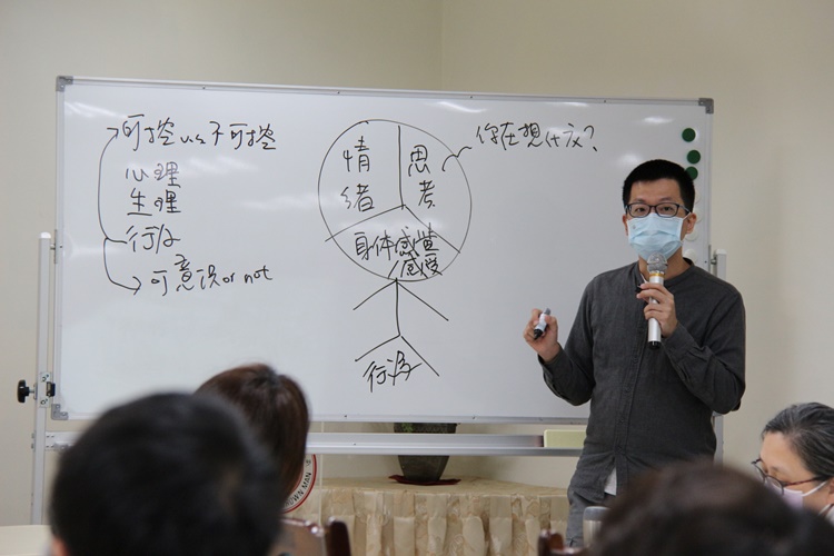 焦慮是什麼感覺?蘇講師一開始,便隨機分組讓大家體驗焦慮,讓組員們共同編製一張焦慮與壓力調查表。有了緊張的感覺後,接著寫下印象中的「焦慮」、「壓力」可能會包含的症狀再分門別類。講師分享當他的個案面臨焦慮時,自己也會請他們將反應「分類」,大致可分為:思考、情緒、身體感覺、行為傾向四種。由於身體感覺、負面思考難以自我控制,唯一能控制的是自己採取的行為,也就是如何去面對和看待害怕的事。釐清心情混亂的來源與各個焦慮反應之間的關係,才可以知道如何行動。其實焦慮並沒有那麼可怕,若生活中不會感到焦慮,可能導致表現不佳,失去前進的動力。