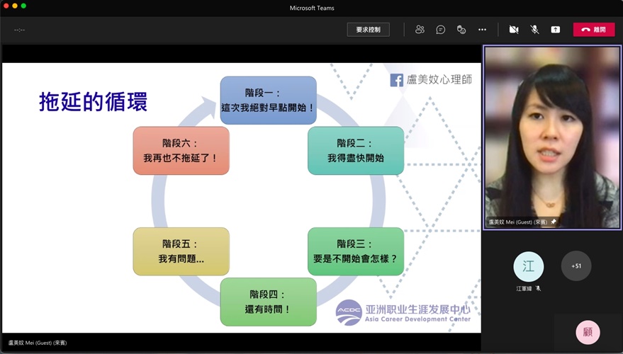 「該做的事情很多,卻沒行動;告訴自己下次絕對要早點開始,卻往往事與願違」,你常陷入這樣的拖延循環嗎?本校健康暨諮商中心邀請諮商心理師盧美妏,於110年11月3日透過線上會議舉辦「告別拖延症—如何幫助自己更有效能的展開行動」講座,帶領同學從心理學角度分析拖延背後的成因,與展開第一步行動的關鍵。