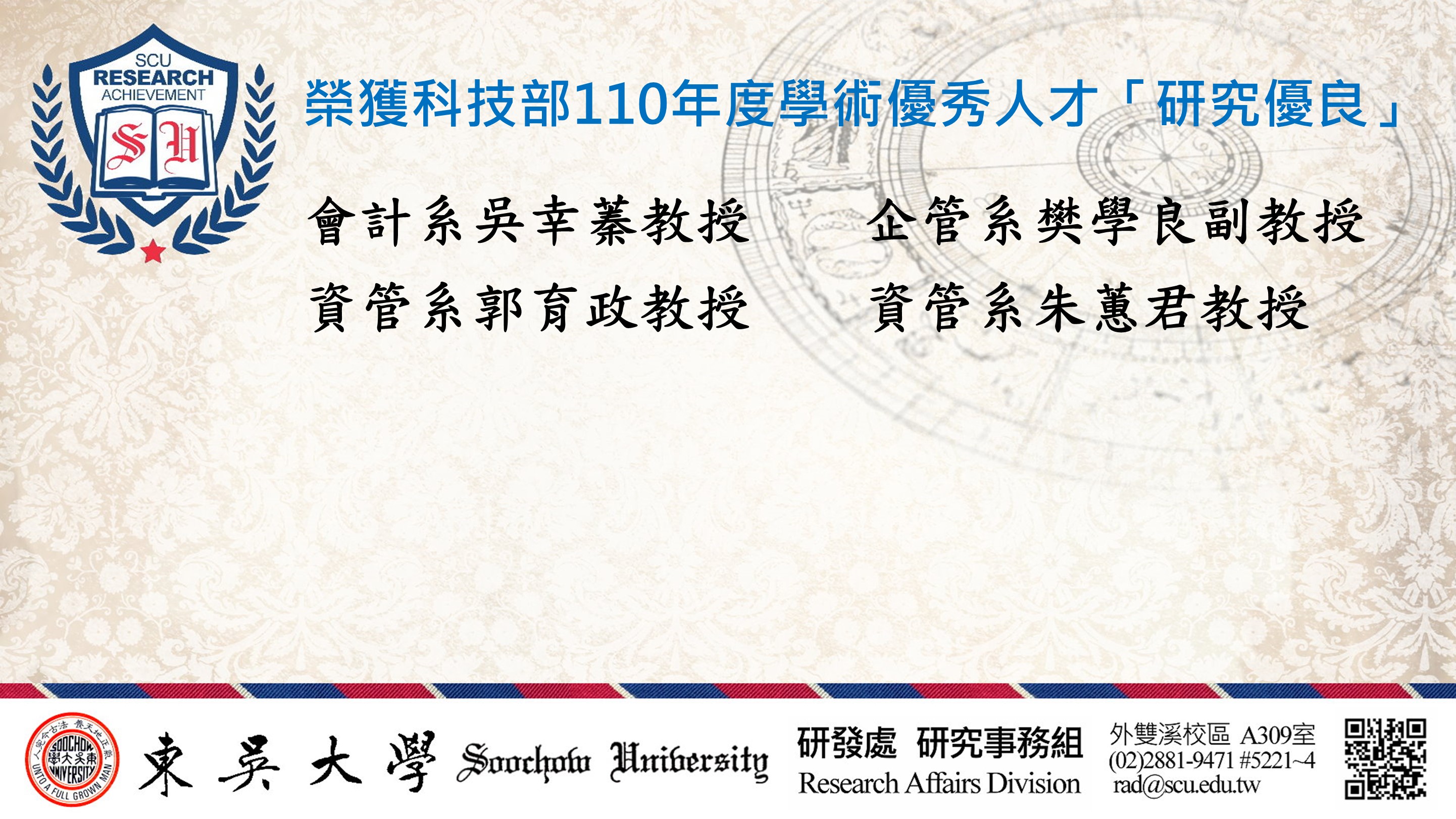 恭喜所有獲獎教師,也期待更多教師能一同投入學術研究,厚實學校研發能量,積極開展研究領域,增加東吳競爭優勢。