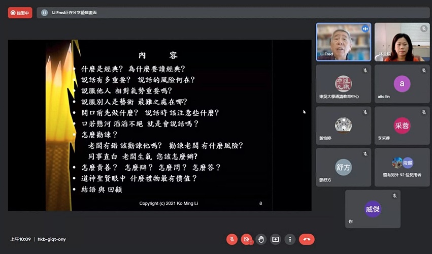 本校通識教育中心於110年12月15日舉辦線上講座「向經典學說話-溝通無礙的藝術」,邀請中華儒道研究協會理事長李克明,與同學們一起透過中華經典發現「老智慧」,以「新思維」掌握說話的藝術,讓大家在日後面臨人際互動難題時,不必搜索西方理論,也能在棘手問題上迎刃而解。