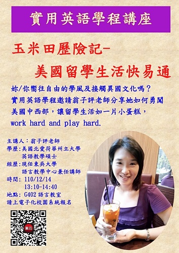 你嚮往留學生活嗎?孤身遠行,又該如何適應留學生活呢?本校語言教學中心於110年12月14日在外雙溪校區G402語言教室舉辦「玉米田歷險記—美國留學生活快易通」講座,邀請現任語言教學中心兼任講師翁子評老師,和大家分享她在美國留學的日常生活。