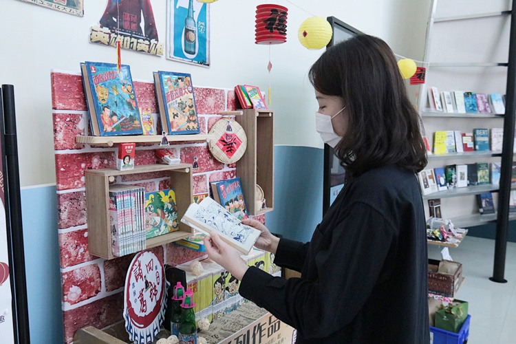 來到圖書館展區,除了有圖書館館藏的《諸葛四郎》漫畫,還有趙維良副校長在當時所購買的《諸葛四郎》漫畫,可供大家閱讀。拿起漫畫之前,還能先到一旁的電子看板前瀏覽漫畫的人物介紹,讓自己更加了解《諸葛四郎》。現場也有復古童玩的互動體驗,例如:打陀螺、踢毽子、尪仔標、丟沙包、跳房子,一關接著一關,不僅如此,還有趣味問答活動,讓大家在玩樂的同時,也能更加熟悉台灣本土文化。懷舊的體驗活動,讓師生們猶如置身過去,一同回味上一代童年的美好記憶。