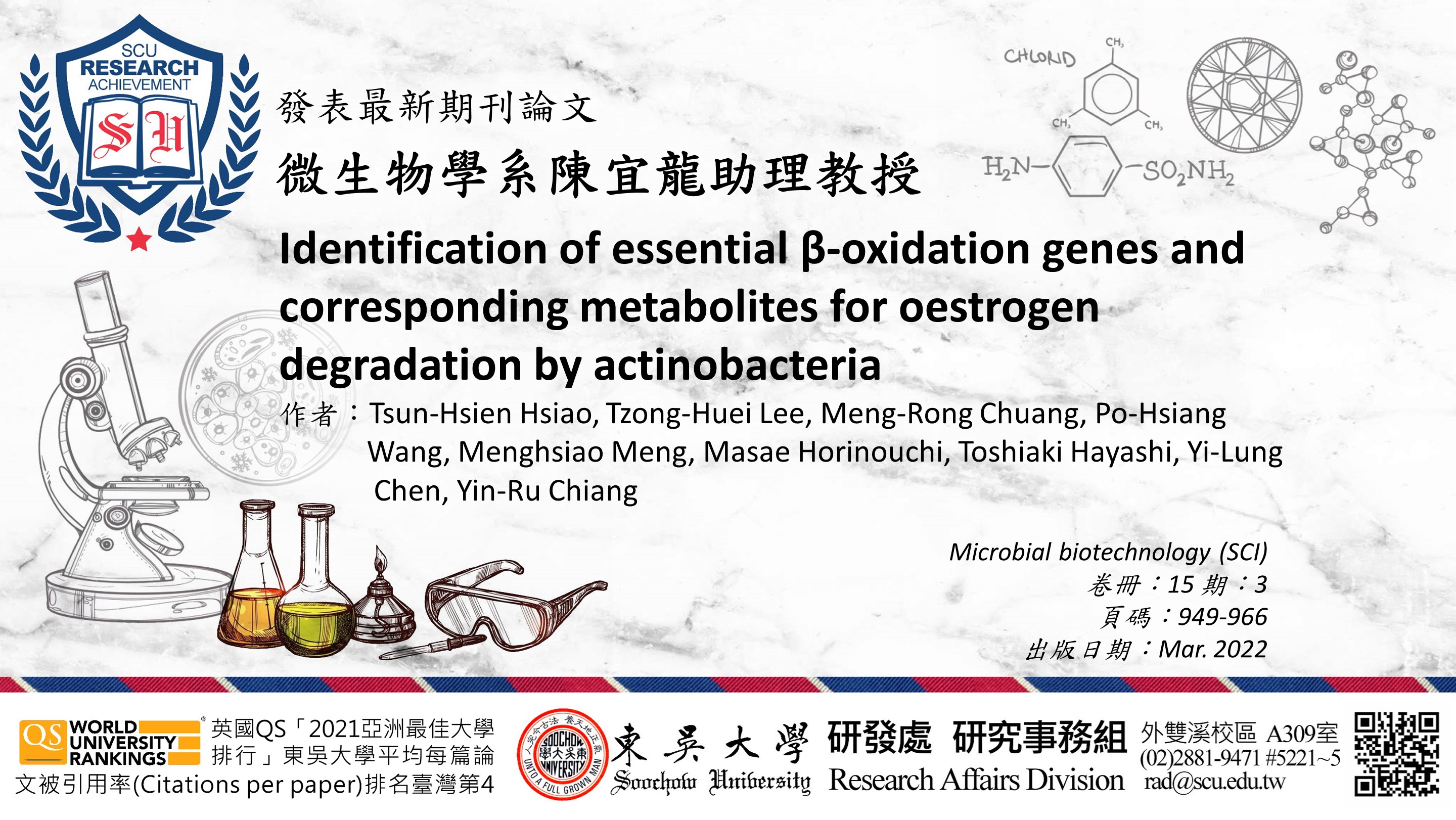 釋放到環境中的雌性激素會干擾其它生物的生理代謝,因此被視為一種環境荷爾蒙。所以,雌性激素如何被微生物分解是生物復育重要的一環。本篇研究指出細菌降解雌性激素所涉及基因的種類,及產生何種中間代謝物。應用本研究結果將有助於找出不同環境中的雌激素分解菌。