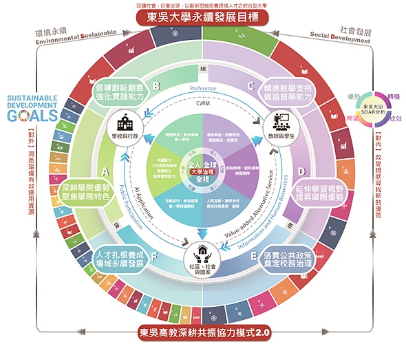 111年度本校將總體計畫定位為達到「東吳大學永續發展」之最終目的,對內透過SOAR分析,盤點與探索學校優勢與轉機,嘗試改變現狀,尋找新契機;對外透過SDGs指標概念的融入,洞悉外部環境與瞭解社會發展,有效運用資源。並與本校校務發展計畫共同以「回饋社會,盱衡全球,以創意思維培養跨域人才之綜合型大學」為總體目標,發展出高教深耕共振協力模式2.0架構圖,以「深耕學院優勢,聚焦學院特色」、「倡導創新創意,強化實踐能力」、「精進教學支持,鍛造自學能力」、「延伸學習視野,提昇國際優勢」、「落實公共政策,奠定校務治理」、「人才扎根養成,場域永續發展」為六大主軸,並以社會責任永續、經濟發展永續、生態環境永續、全球夥伴永續為發展方向,期藉由計畫推動,實踐本校永續發展之遠景。