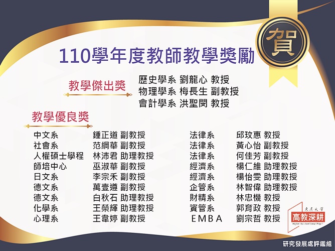 為肯定教師在教學上之努力與貢獻,並提升本校教學品質,每年定期辦理教師教學獎勵活動,經由各學系(室)、師生或畢業校友連署等方式,推薦符合本校「教師教學獎勵辦法」規定之專任教師為教學獎勵候選人。
