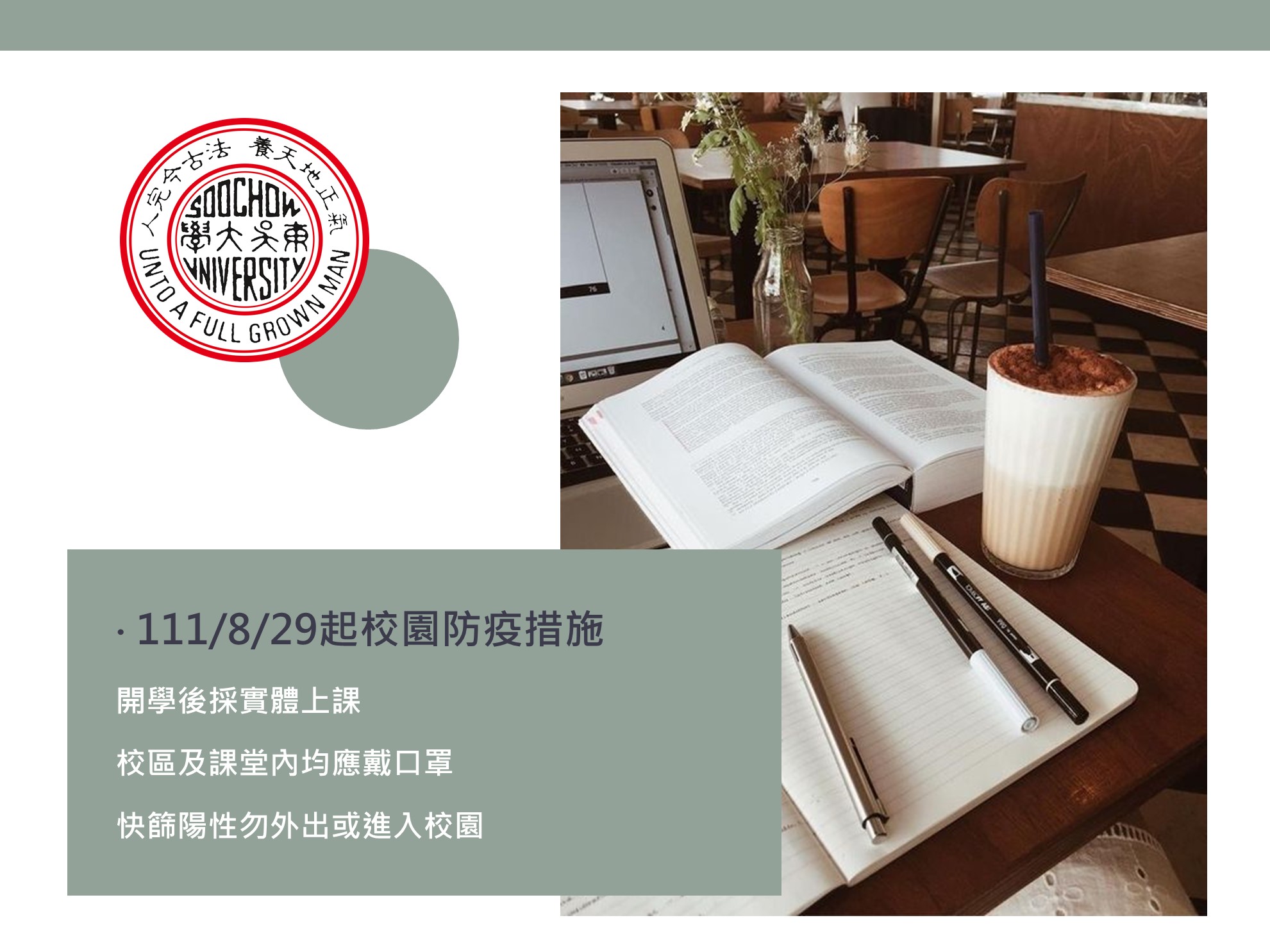 一、開學後採實體上課,校區及課堂內均應戴口罩,持續落實防疫好習慣。