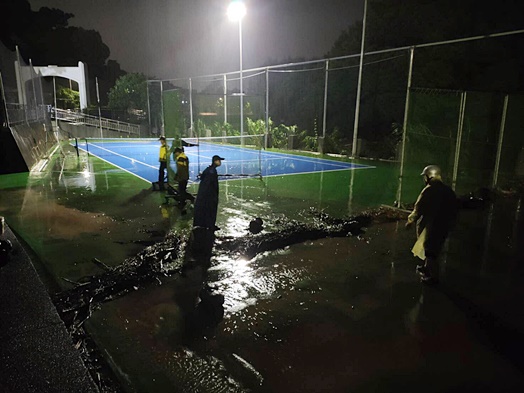 颱風尼莎挾帶豪雨,各地均傳出淹水和路樹倒塌災情,其中北部和東部災情甚為慘重。本校校園則是於10月16日傍晚於外雙溪校區A哨、網球場、第二教研大樓和圖書館行政區發生淹水狀況,幸賴校安中心、總務處、圖書館等單位緊急處理應變,晚間7點多當水位稍退後,事務組相庚祥副組長親自帶領同仁及工友先生們進行淤泥清除,齊心協力快速恢復校園各處景觀。
