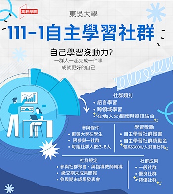 本校學生於本學期(111-1)積極參與本組辦理之「學生自主學習社群」計畫,報名相當踴躍,參與組數及人數分別為38組168人(語言學習類別:20組/92人、跨領域類別11組/49人、在地(人文)關懷與資訊結合類別:7組/27人),從初審學生繳件之申請書內容,可見學生提出各類多樣化的學習主題,期待學生豐碩的自學成果與表現。
