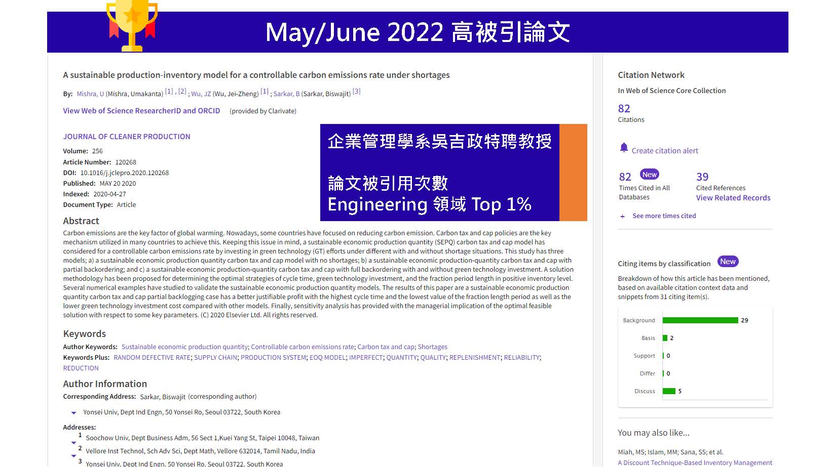 • 企業管理學系吳吉政特聘教授之論文被引用次數列入「Engineering」學術領域的前 1%,2020年合著:《A sustainable production-inventory model for a controllable carbon emissions rate under shortages》