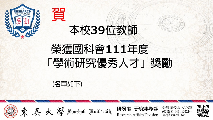 本校為延攬研究優秀人才及鼓勵教師進行學術研究,提升學術成果,依「國科會補助大專校院研究獎勵作業要點」及「東吳大學學術研究優秀人才獎勵辦法」,由各學院推薦符合「研究傑出」、「研究優良」、「延攬新聘」及「獎勵新聘」獎勵條件之教師,提送學術研究委員會審查,並經校長核定。國科會111年度「學術研究優秀人才」獎勵,共計39位教師獲獎,名單如下:
