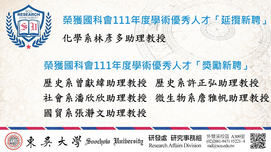 恭喜所有獲獎教師,也期待更多教師能一同投入學術研究,厚實學校研發能量,積極開展研究領域,增加東吳競爭優勢。