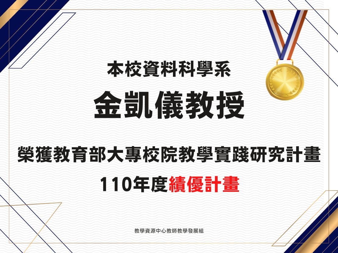 在此恭喜金凱儀教授獲選年度績優計畫,有此佳績,實屬不易,為本校教學實踐研究樹立良好楷模。期能激勵本校教師投入教學實踐研究計畫行列,在此也感謝所有申請教師們一年來的辛勞!