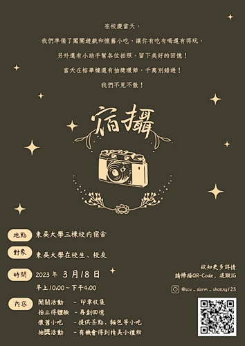 同樣不容錯過的還有學生宿舍舉辦的「何處歸宿?『攝』在此處」活動,提供套圈圈、劍玉等懷舊遊戲,以及拍立得讓來賓與懷舊背景合影,歡迎住宿生和校友們邀請三五好友至學生宿舍回憶在學時的美好時光。而懷恩數位校史館、圖書館及安素堂也開放參觀,歡迎大家進行巡禮。另外,在日文系吳美嬅老師的帶領下,日本茶道社將日本賞櫻茶宴直接復刻到校內,春暖花開之時,葉縫間灑落的陽光,搭配優美的茶道表演,為校慶活動增添了詩意,也成為東吳校慶傳統美麗的一幕。