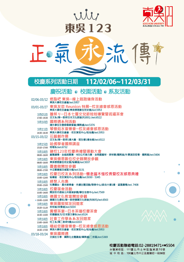 東吳正氣永流傳 建校123年校慶3/18隆重登場