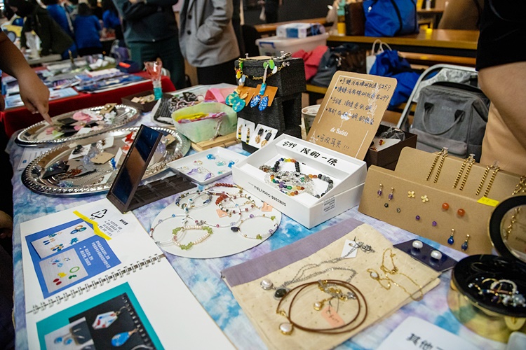 綠聚人市集呼應SDGs發展目標,以「綠」為關鍵字,設有永續理念攤位如:美食藝術社、調酒社、電影社等,提供自備環保餐具折價五元的優惠,提倡環保概念。其中HeycaKe攤位製作的杯子蛋糕使用減糖原料,對應SDG3健康與福祉;而社工系碩士班蔡仲環的首飾攤位令人耳目一新,不僅有由回收寶特瓶製成的耳飾,還有塑膠袋轉變而來的收納包,她所配戴的項鍊更是由鐵鋁罐拉環製成,就是希望人們透過觀念上的改變、養成不浪費的習慣,有益於地球的未來。