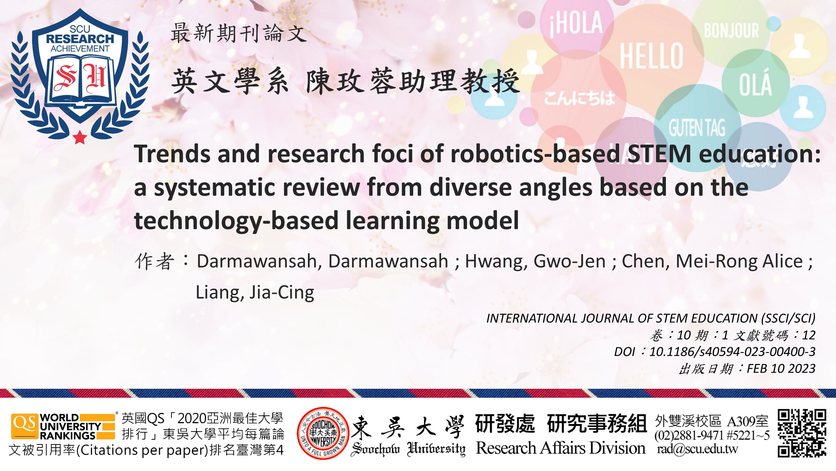 研究事務組提醒:教師如有最新發表於AHCI、SSCI、SCI、EI、TSSCI、THCI、「東吳大學外語學門獎勵名單」之期刊論文,歡迎將相關資訊e-mail至rad@scu.edu.tw,研究發展處將會公告於校園頭條,以廣交流。