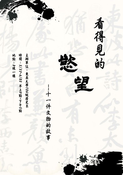 歷史學系於5月31日至6月3日在第二教學研究大樓一樓大廳,舉行大三學生學習成果展:「看得見的慾望:11件文物的故事」。本次展覽由系主任林慈淑老師指導,並在黃文顥和曾宇宸兩位助理協助下,歷史三同學選擇了11件故宮博物院的文物,以半年時間研究籌畫而成。此次活動承歷史系友會贊助,所有文物影像都經故宮博物院授權。