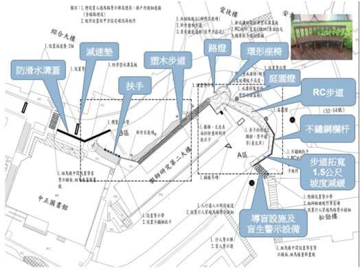 為促進學生安全和解決同學在臨溪路上與車爭道的問題,總務處規劃於校內主要道路上規劃綠色人行步道及三條斑馬線,提供全校師生一個安全的步行空間。另外,為因應校內視障同學需要,學校成功向教育部申請到經費,改善教師研究二樓前的人行步道,增設導盲警示和照明、減緩坡道及更換水溝蓋。
