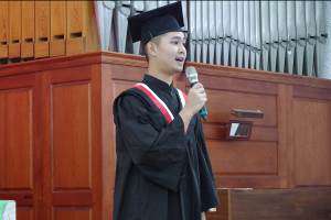 畢業生代表陳建廷同學致謝詞,帶領大家坐上時光機,重新回顧大學四年,因修習學系多元專業的課程與實驗操作得到豐碩的學術知識,也特別感謝系上師長的用心教導。為感念這些年一路相伴的師長、家人和同學們,全體畢業生獻唱催淚驪歌:今年夏天,來表達他們不捨離別卻會勇敢向前的心意;系上教師也回贈給畢業生印有「東吳大學」的小書包作為紀念禮物。畢業生則捧著親手製做的康乃馨獻給父母與家人,感謝養育與栽培之恩。在校生代表林璟衡同學致答詞,感謝學長姐這些年在課業與生活上點點滴滴的照顧,並且獻上一段青春無限的舞蹈與歌曲祝賀畢業生,將全場氣氛炒熱到最高點,在一片驚喜歡呼聲中典禮畫下句點。