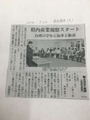 經濟學系碩士班研究生陳偉傑同學2015年7月19至27日參加由日本外務省、日本外交部、日本交流協會與中華經濟研究院日本中心共同舉辦的『日台青少年交流訪日團(JENESYS-2106-經濟)』活動,此行不僅認識許多優秀的同儕,活動的安排更讓陳同學此生難忘,行程包括參加各種有關日本經濟的講座(與區域經濟整合TPP相關);與明治大學的大學生交流;參訪日本傳統產業及中小企業;拜訪福井縣知事;了解福井縣的自然農法;及最難忘的福井農家homestay。陳同學參加經濟講座及參訪日本中小企業的分享如下: