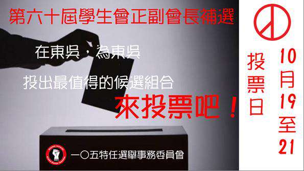 東吳學生會在本(105)學年度邁入一甲子,是全國學生自治的領域之中,歷史最悠久,並且落實行政-立法-司法三權分立制度最為完善的學生會,第60屆學生會需要您的支持!請同學於投票期間攜帶學生證進行投票,為學生自治寫下美好的一頁!!