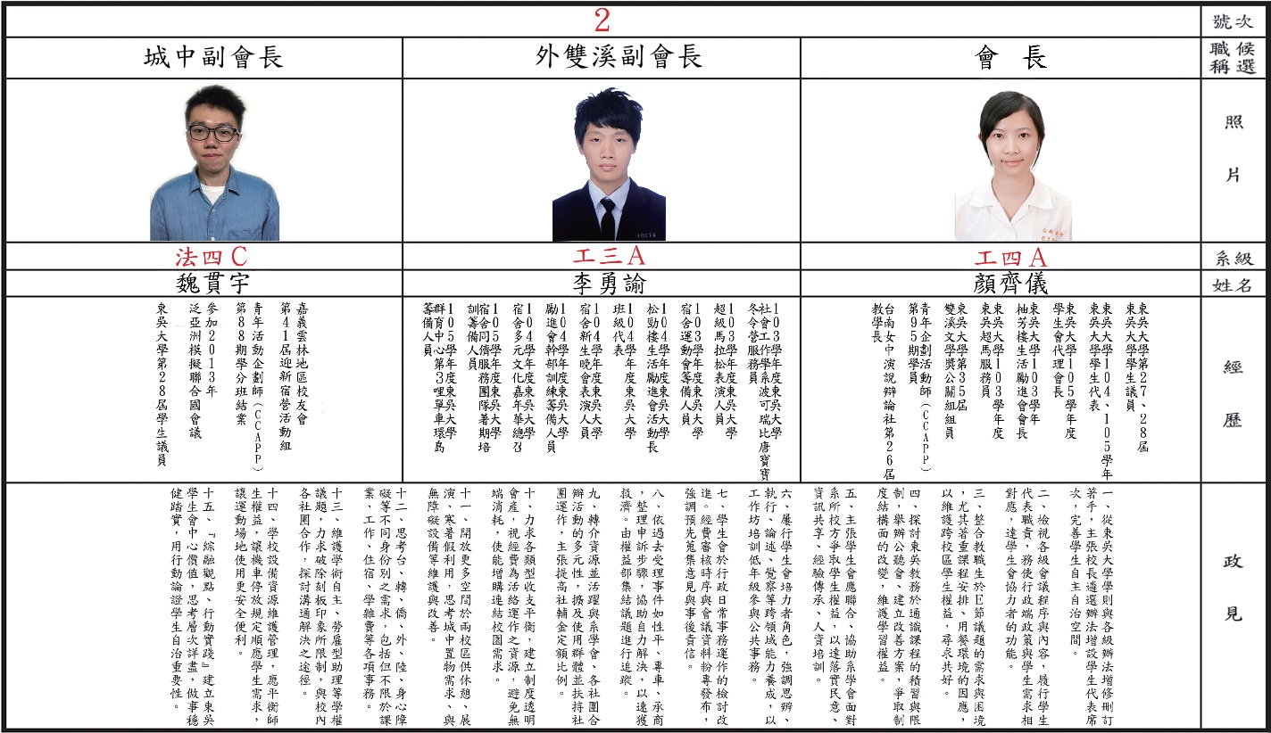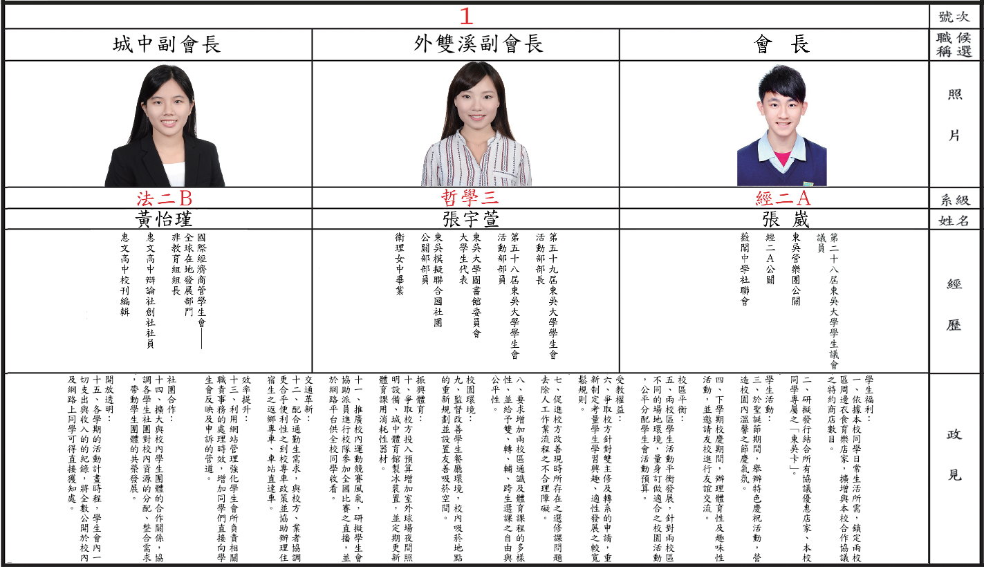政見發表會影片內容請上「東吳大學選舉事務委員會」粉絲專頁查詢: