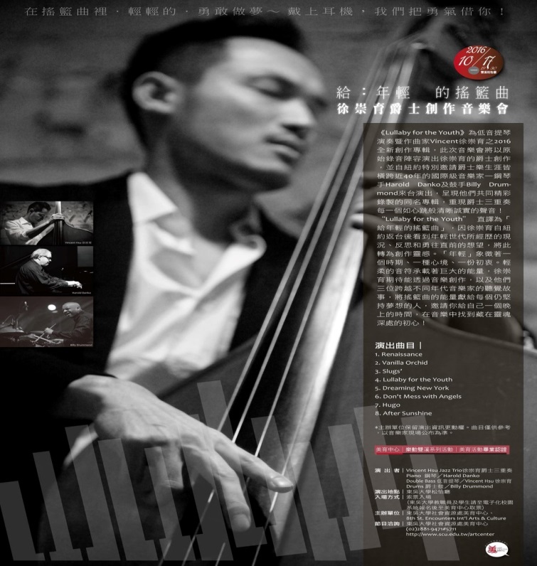 本校美育中心榮幸地邀請到Vincent徐崇育,以及自紐約遠渡重洋,音樂生涯已逾四十年的國際級音樂家──鋼琴手Harold Danko及鼓手Billy Drummond來台演出,於10月17日(星期一)19時30分蒞臨雙溪校區松怡廳登台演奏,將「年輕」的象徵:一個時期、一種心境、一份初衷,以輕柔的音符承載著巨大的力量,將搖籃曲的能量獻給每個仍堅持夢想的你。