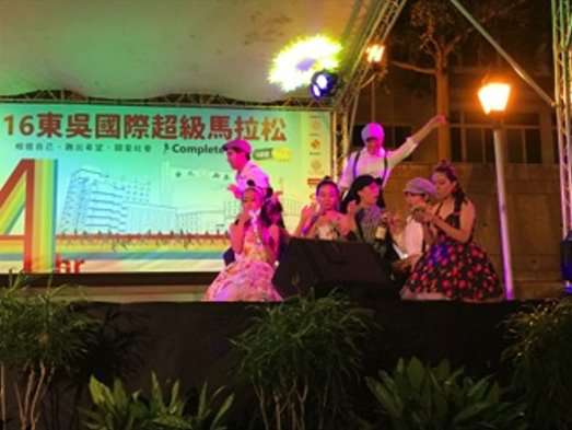 2016東吳超馬於今年12月3日上午9時正式開跑,從白天到黑夜,跑道上的跑者以堅強的毅力持續向前,場邊志工的加油聲從不間斷,但入夜之後,寵惠堂前的舞台燈亮了,東吳大學超級馬拉松的另一項重頭戲,精彩的晚間表演活動熱鬧登場,不論是深情歌唱、賣力跳舞,還是動情的戲劇表演,心之所向,都是希望帶給場上的跑者們更多的力量。