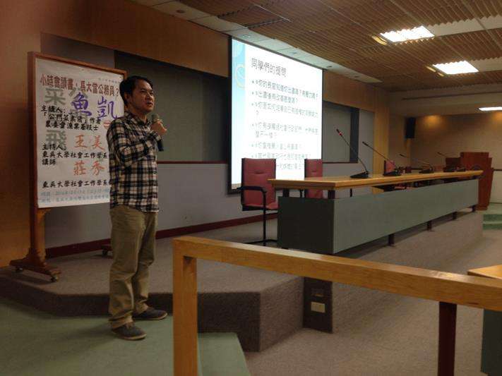 從事生物科學相關工作、擁有工程背景,任職六年公務員的作家林于凱(筆名為魚凱),於105年12月13日受邀至東吳大學,和同學分享公職生涯的歷程及對人生的新看法。