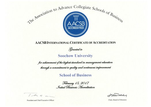 AACSB為國際商管學院認證之首且最具公信力及權威性的商管學院教育認證機構,目前全球有53個國家中786所大學通過認證,包含美國的哈佛、耶魯、英國的劍橋、牛津大學等名校。東吳大學商學院繼台大、政大與輔大等校後獲得此國際認證且與全球知名學校並駕齊驅,不僅是商學院榮獲殊榮,更對於東吳大學在國際化與國際間之校譽提升,有著積極的幫助。