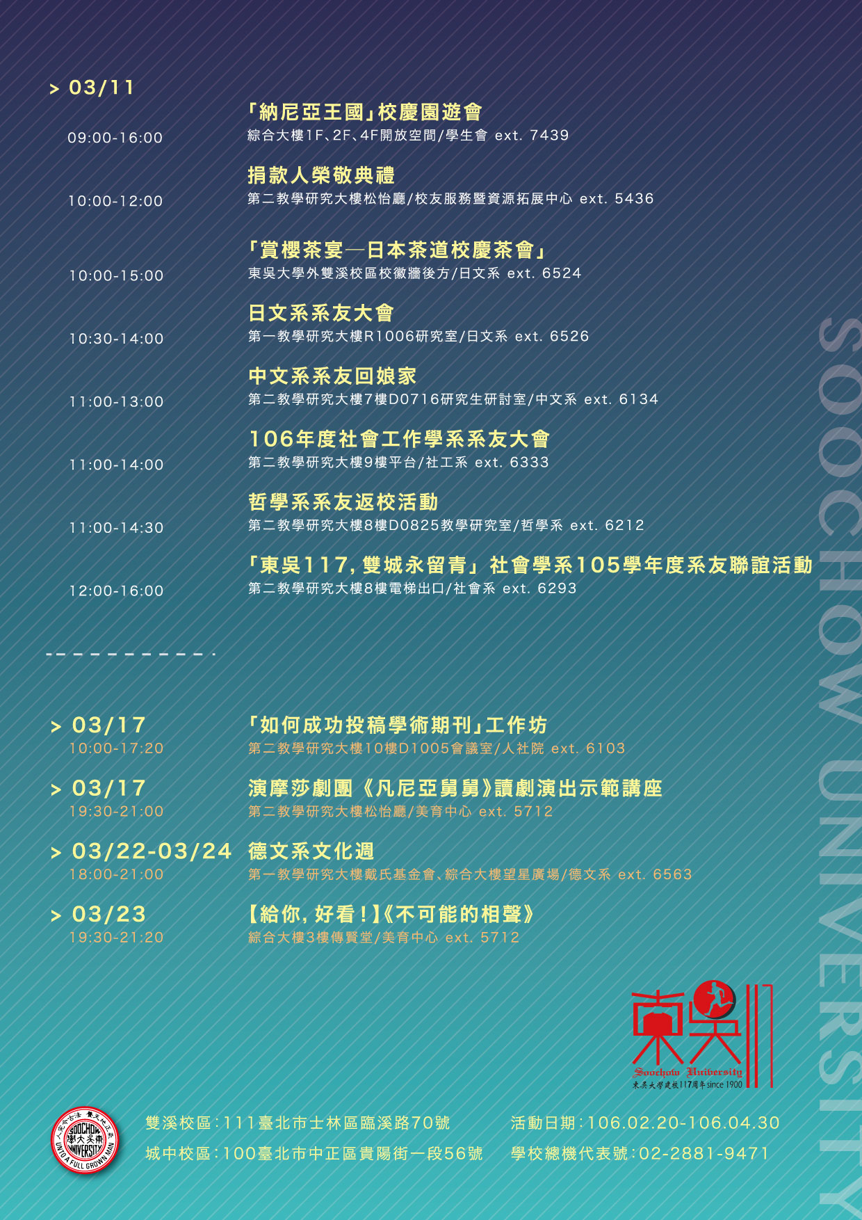 東吳大學建校117周年校慶運動會,於3月11日早上8時30分,藉由學系的創意繞場表演揭開序幕。各地區畢業校友也參與繞場盛事,凝聚彼此情誼,一同歡慶東吳大學生日快樂!
