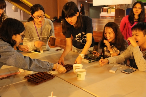 活動一開始,由系學會幹部向各桌分發製作巧克力彩蛋的模具,半橢圓型的模具再倒上香氣濃郁的巧克力槳,一口一顆大滿足的復活節巧克力彩蛋便有雛形。同學們一人捧著巧克力漿,一人小心翼翼地調整模具位置,另一人不忘最後在巧克力裡放入鬆脆增加彩蛋口感的米香。團結協作後,同學們就回歸自己位置,耐心地等待巧克力凝固。