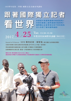 本校國際處於4月25日在國際會議廳主辦「國際文化名師系列講座」,邀請到曾是SOS戰地記者、現為國際獨立記者的楊智強先生,他用幽默風趣的言談,分享他一路從國內媒體業到國際獨立記者的心路歷程。