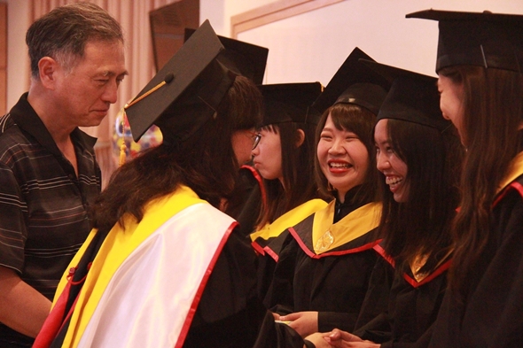 畢業生代表盧佩筠說,感謝父母,沒有他們無私地栽培、支持,不會有今日典禮台上的自己;感謝每一位師長專業科目的指引,如茫茫學海中一盞盞明燈;感謝身旁的朋友,學術切磋、生活陪伴、低潮扶持,一路走來我們竟要畢業,在生命的驛站路口互相擁抱、道別。