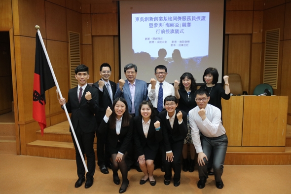 東吳創新創業基地同儕服務員授證暨參與「海峽盃」競賽行前授旗儀式於106年6月22日在城中校區5117會議室舉行,校長潘維大、主任秘書兼社資長王淑芳、商學院院長傅祖壇、企管系主任胡凱傑、生涯發展中心主任王俊雯等師長皆出席此次授旗儀式。