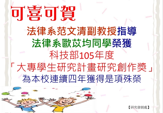 本次得獎者為:法律系李貴英教授指導周耘任同學,研究主題為「從1978附加機制規則與OPIC案談臺灣運用ICSID爭端解決機制的可能性」;法律系范文清副教授指導歐苡均同學,研究主題為「他愛他,她愛她,我們結婚吧!論同性婚姻合法化」;資管系朱蕙君副教授指導王琳同學,研究主題為「結合穿戴裝置生理感測訊號與自律學習機制之行動睡眠醫療輔助APP」;資管系朱蕙君副教授指導洪慈吟同學,研究主題為「提升程式邏輯及問題解決能力之3D程式設計情境遊戲式學習系統」。