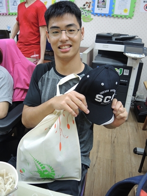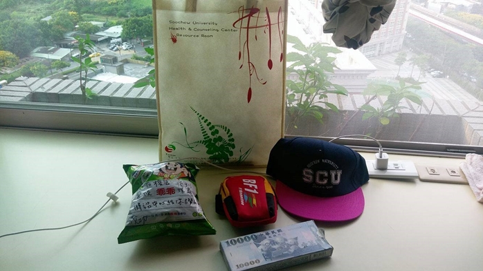 在出發前,健康暨諮商中心聚集資源教室同學及老師們一同來集氣並給予祝福,由姚淑文主任代表贈送激勵打氣包,包含東吳遮陽帽—象徵東吳的精神與他們同在;萬元盤纏糖果禮--象徵物質不缺;手腰包—象徵展翅飛翔;乖乖包—祝福一切順利。這一路相信在大家祝福下,必能豐富他人也能成就自我,也期待大家為他們加油打氣唷!