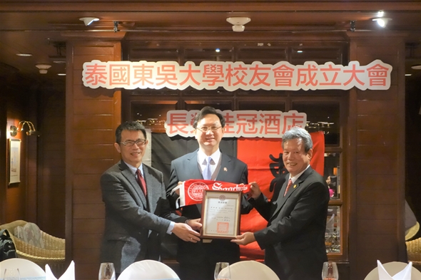2017年12月10日泰國東吳大學校友會於曼谷長榮桂冠酒店舉行成立大會。潘維大校長率領胡凱傑國際長、王淑芳社會資源長、國際中心歐素華主任、校友資拓中心莊琬琳主任,及東吳大學校友總會劉詩聖總顧問等出席慶賀。第一屆泰國東吳校友會會長為本校會計系畢業的李峰春學長,李會長是李林股份有限公司董事長,於泰國經商30多年,為泰國台灣商會聯合總會榮譽總會長,泰國海華協會創會共同主席,第13屆海外磐石獎得主,卓越幹練,績望並彰,回饋社會,服務僑界及商社不遺餘力,此次榮任本校泰國地區校友會會長,實謂眾望所歸。