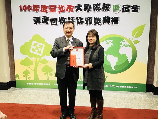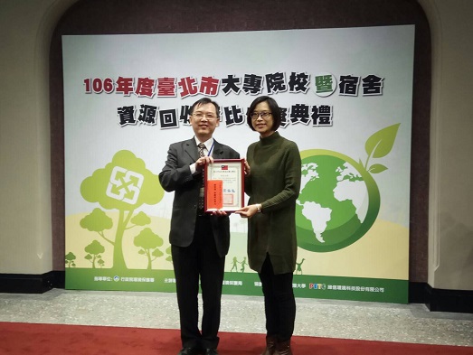 為使資源回收觀念深植校園,臺北市環保局持續辦理「106年大專院校資源回收評比」,並在今年首次針對校園內宿舍進行評鑑,於106年12月19日舉行頒獎活動。今年度共計27所大專院校參與資源回收評比,本校脫穎而出,在大專院校資源回收評比中獲得第1名的殊榮,近4年來已3次奪冠,更在首次辦理的宿舍資源回收評比中榮獲「優等獎」。