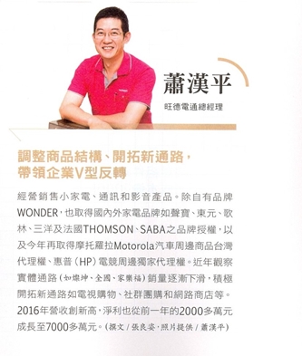 蕭漢平學長現任旺德電通總經理,曾獲中華民國第37屆青創楷模,他利用品牌授權合作的商業模式做出市場區隔,達到原廠、消費者、代理商三贏的局面,並調整商品結構、積極開拓新通路,帶領企業V型反轉。
