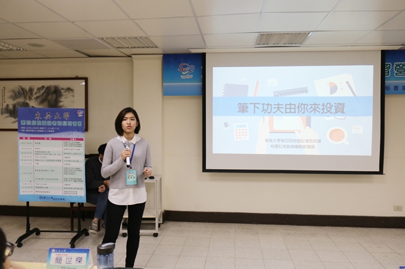 研習營中,校園記者資深幹部群擔綱研習營講師,由總編輯王俐文同學與副編輯陳姿仰同學教導影音新聞製作,而副編輯歐陽葳同學則向實習記者們說明如何編寫採訪企劃架構等寫作技巧。希望校園記者們皆能透過此次研習營更了解新聞報導的要點及技巧,未來藉由文字與鏡頭傳遞東吳的真善美。